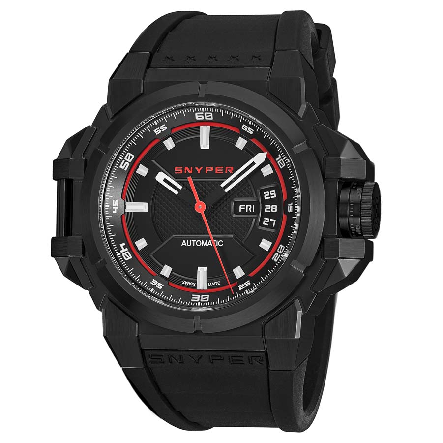 Black PVD stainless steel case with a black rubber strap. Fixed black PVD bezel. Black textured center (red ring) dial with black skeleton hands and index hour markers. Arabic numeral minute markings (at 5 minute intervals). Minute markers around the outer rim. Dial Type: Analog. Luminescent hands. Day of the week and date display at the 3 o'clock position. Snyper calibre F100 automatic movement with a 48-hour power reserve. Scratch resistant sapphire crystal. Screw down crown. Solid case back. Round case shape. Case size: 48 mm. Case thickness: 15 mm. Band width: 28 mm. Tang clasp. Water resistant at 100 meters / 330 feet. Functions: date, day, hour, minute, second. Sport watch style. Watch label: Swiss Made. Snyper Two Automatic Mens Watch 20.200.00.