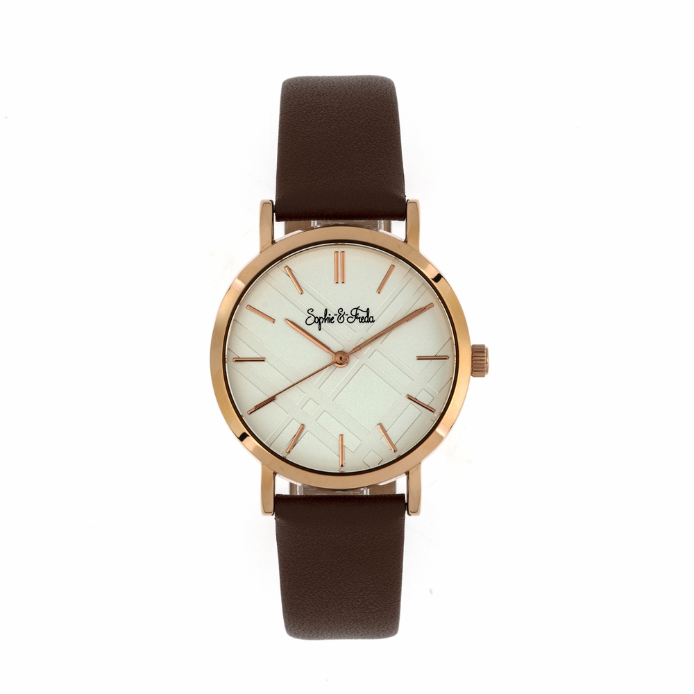 Rose gold-tone alloy case with a brown genuine leather strap. Fixed rose gold-tone alloy bezel. White dial with rose gold-tone hands and index hour markers. Dial Type: Analog. Quartz movement. Scratch resistant mineral crystal. Pull / push crown. Solid case back. Round case shape, case size: 36 mm, case thickness: 9 mm. Band width: 18 mm. Buckle clasp. Water resistant at 30 meters / 100 feet. Functions: hour, minute, second. Casual watch style. Watch label: Japan Movt. Item Variations: SAFSF5004. Sophie And Freda Budapest Quartz White Dial Ladies Watch SF5004.