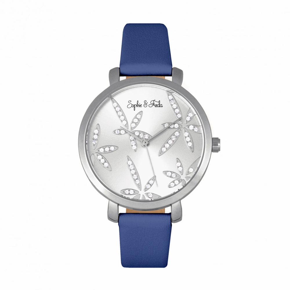 Silver-tone alloy case with a blue genuine leather strap. Fixed silver-tone alloy bezel. Silver-tone dial with silver-tone hands. Dial Type: Analog. Quartz movement. Scratch resistant mineral crystal. Pull / push crown. Solid case back. Round case shape, case size: 35 mm, case thickness: 9 mm. Band width: 9 mm. Buckle clasp. Water resistant at 30 meters / 100 feet. Functions: hour, minute, second. Dress watch style. Watch label: Japan Movt. Item Variations: SAFSF4301. Sophie And Freda Key West Silver Dial Ladies Watch SF4301.