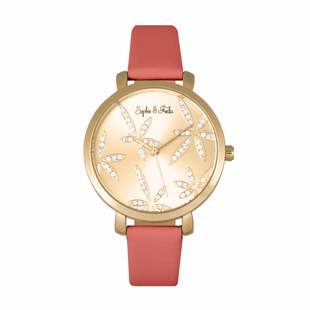 Gold-tone alloy case with a dark pink genuine leather strap. Alloy gold alloy bezel. Gold-tone dial with gold-tone hands. Dial Type: Analog. Quartz movement. Scratch resistant mineral crystal. Pull / push crown. Solid case back. Round case shape, case size: 35 mm, case thickness: 9 mm. Band width: 9 mm. Buckle clasp. Water resistant at 30 meters / 100 feet. Functions: hour, minute, second. Dress watch style. Watch label: Japan Movt. Item Variations: SAFSF4304. Sophie And Freda Key West Gold Dial Ladies Watch SF4304.