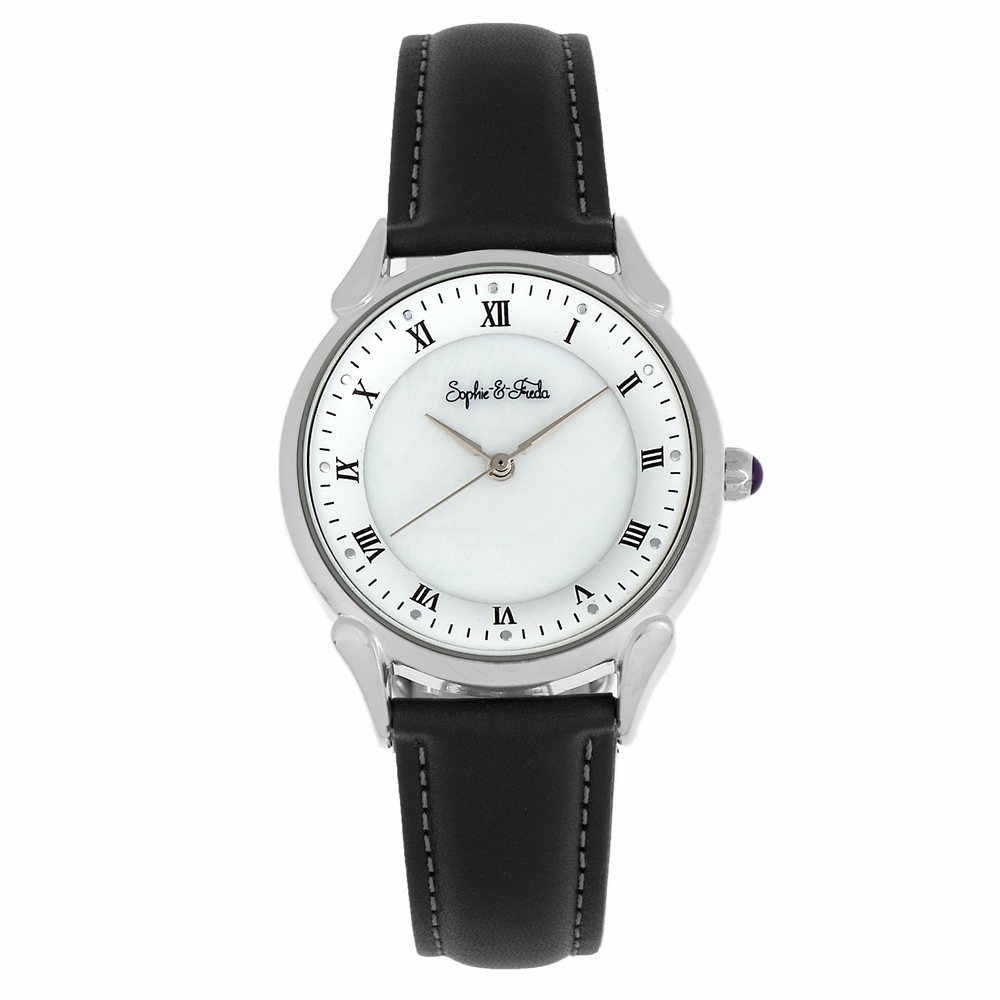 Silver-tone alloy case with a black genuine leather strap. Fixed silver-tone alloy bezel. White dial with silver-tone hands and Roman numeral hour markers. Minute markers around the outer rim. Dial Type: Analog. Quartz movement. Scratch resistant mineral crystal. Pull / push crown. Solid case back. Round case shape, case size: 33 mm, case thickness: 9 mm. Band width: 16 mm. Buckle clasp. Water resistant at 30 meters / 100 feet. Functions: hour, minute, second. Casual watch style. Watch label: Japan Movt. Item Variations: SAFSF5501. Sophie And Freda Mykonos Quartz White Dial Ladies Watch SF5501.