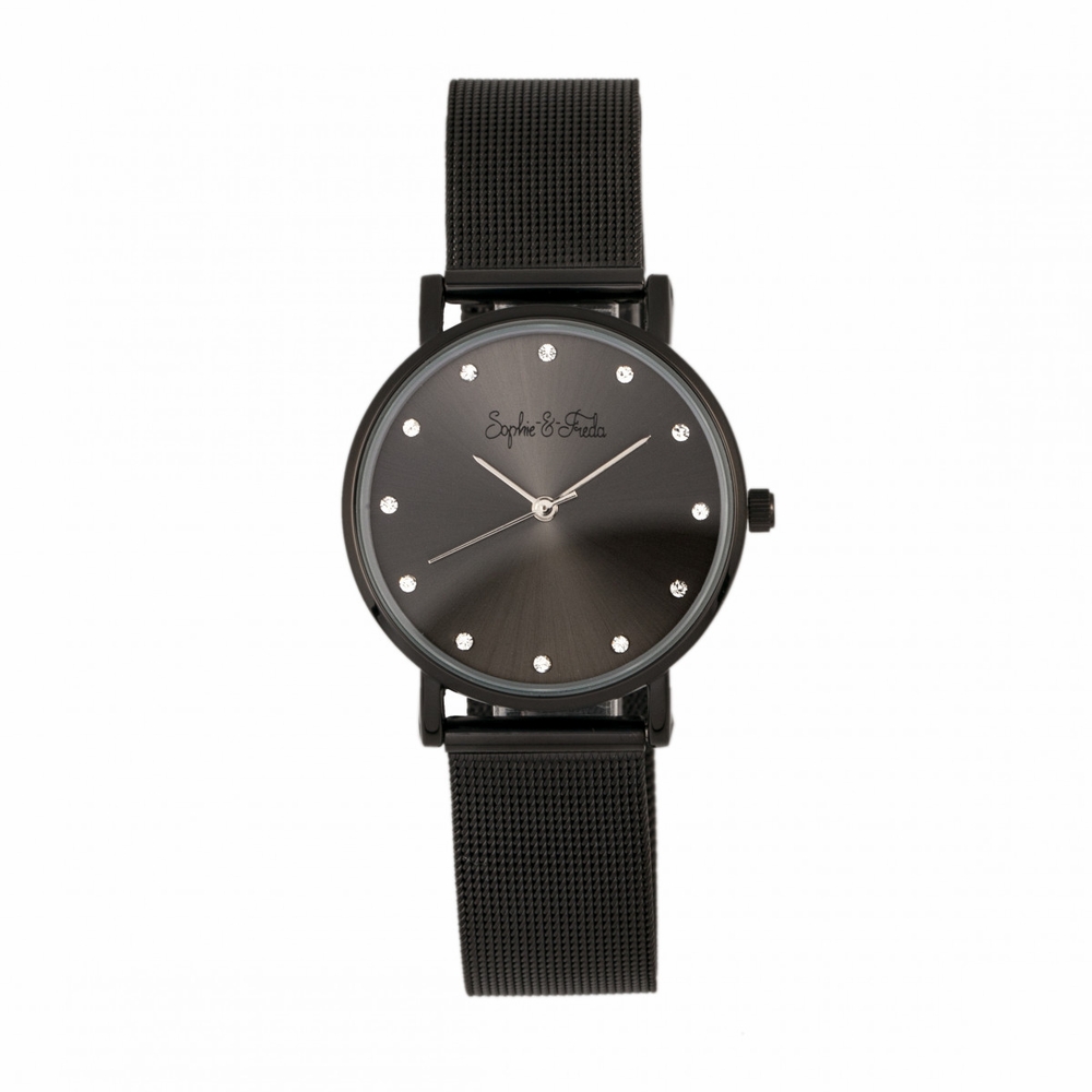 Black alloy case with a black alloy bracelet. Fixed black alloy bezel. Black dial with silver-tone hands and crystal hour markers. Dial Type: Analog. Quartz movement. Scratch resistant mineral crystal. Pull / push crown. Solid case back. Round case shape, case size: 32 mm, case thickness: 8 mm. Band width: 16 mm. Box with tongue and safety clasp. Water resistant at 30 meters / 100 feet. Functions: hour, minute, second. Dress watch style. Watch label: Japan Movt. Item Variations: SAFSF4203. Sophie And Freda Savannah Crystal Black Dial Ladies Watch SF4203.