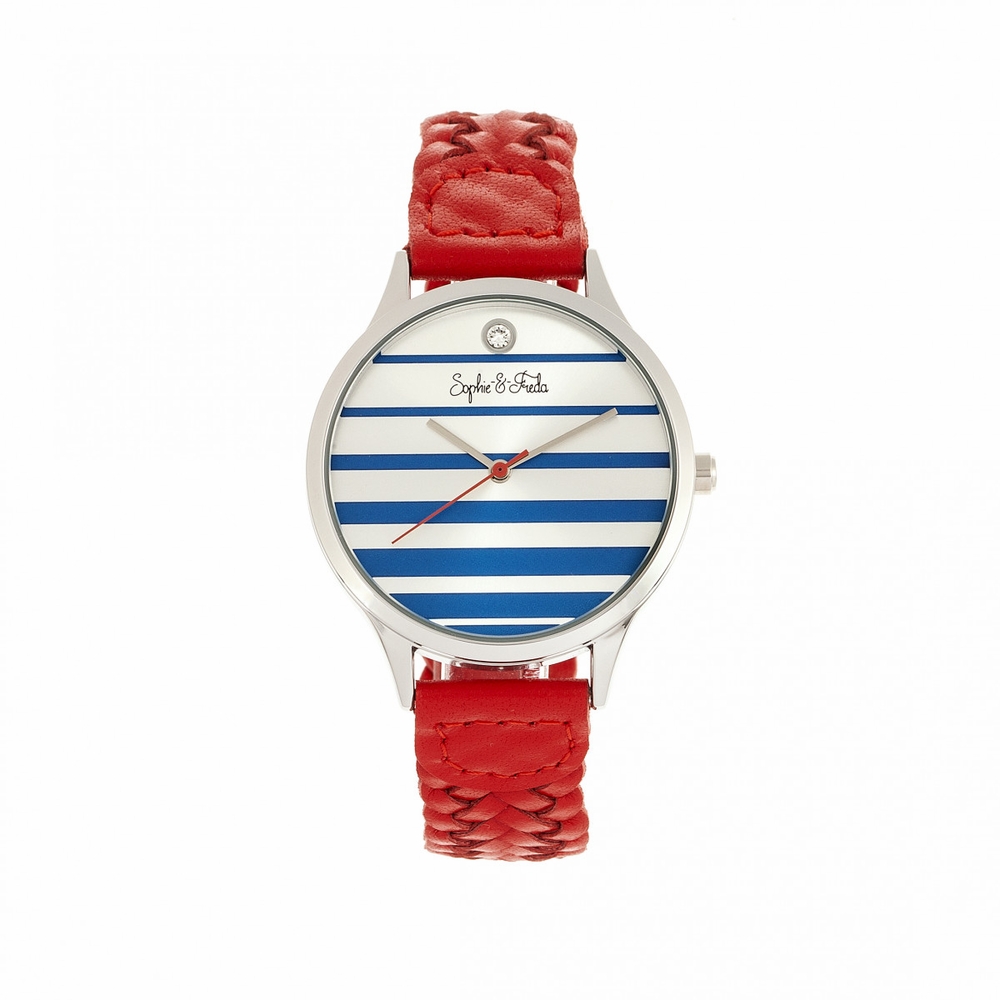 Silver-tone alloy case with a red genuine leather strap. Fixed silver-tone alloy bezel. Silver-tone dial with silver-tone hands. Dial Type: Analog. Quartz movement. Scratch resistant mineral crystal. Pull / push crown. Solid case back. Round case shape, case size: 36 mm, case thickness: 8 mm. Band width: 11 mm. Buckle clasp. Water resistant at 30 meters / 100 feet. Functions: hour, minute, second. Casual watch style. Watch label: Japan Movt. Item Variations: SAFSF4501. Sophie And Freda Tucson Silver Dial Ladies Watch SF4501.