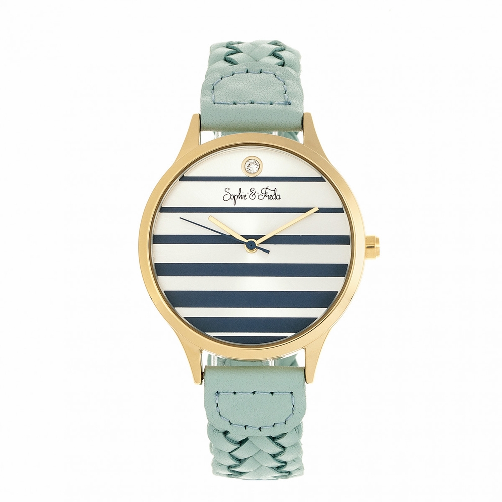 Gold-tone alloy case with a light blue genuine leather strap. Alloy rose gold-tone alloy bezel. Silver-tone dial with gold-tone hands. Dial Type: Analog. Quartz movement. Scratch resistant mineral crystal. Solid case back. Round case shape, case size: 36 mm, case thickness: 8 mm. Band width: 11 mm. Buckle clasp. Water resistant at 30 meters / 100 feet. Functions: hour, minute, second. Watch label: Japan Movt. Item Variations: SAFSF4504. Sophie And Freda Tucson Silver Dial Ladies Watch SF4504.