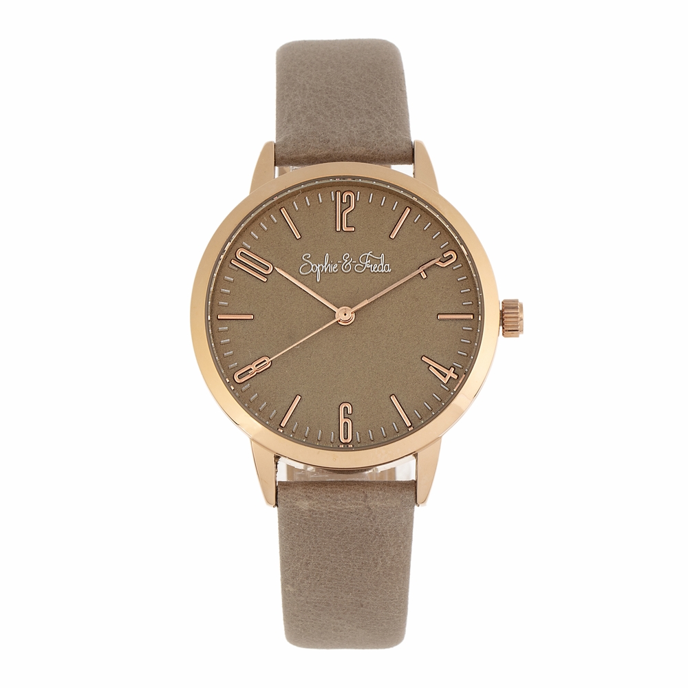 Rose gold-tone alloy case with a tan genuine leather strap. Fixed rose gold-tone alloy bezel. Tan dial with rose gold-tone hands and Arabic numeral and index hour markers. Minute markers around the outer rim. Dial Type: Analog. Quartz movement. Scratch resistant mineral crystal. Pull / push crown. Solid case back. Round case shape, case size: 36 mm, case thickness: 9 mm. Band width: 16 mm. Buckle clasp. Water resistant at 30 meters / 100 feet. Functions: hour, minute, second. Casual watch style. Watch label: Japan Movt. Item Variations: SAFSF4904. Sophie And Freda Vancouver Quartz Ladies Watch SF4904.