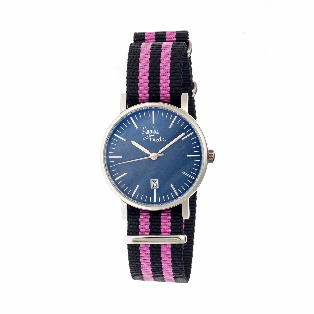 Stainless steel case with a black and pink nylon strap. Fixed stainless steel bezel. Black dial with silver-tone hands and index hour markers. Minute markers around the outer rim. Dial Type: Analog. Date display at the 6 o'clock position. Precision Japanese Quartz Movement quartz movement. Scratch resistant mineral crystal. Pull / push crown. Solid case back. Case size: 36 mm. Case thickness: 10 mm. Round case shape. Band width: 18 mm. Tang clasp. Water resistant at 30 meters / 100 feet. Functions: date, hour, minute, second. Casual watch style. Item Variations: SAFSF3302. Sophie And Freda Nantucket Ladies Watch SF3302.