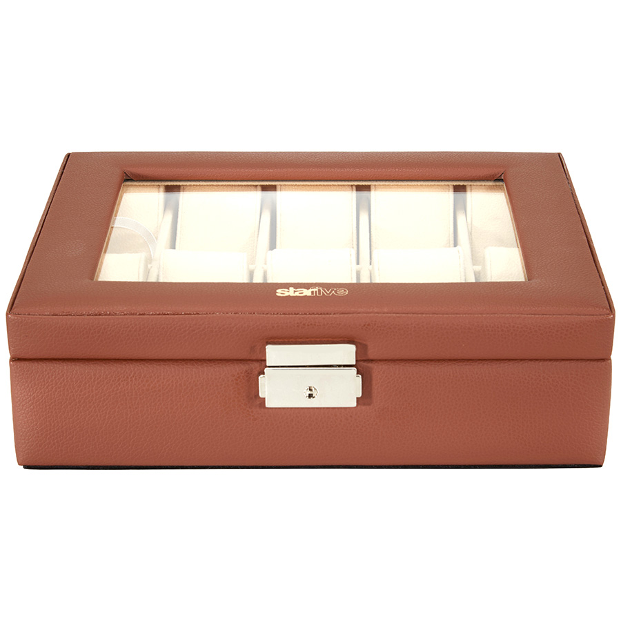 StarFive 10-piece lockable watch box in brown PU leatherette with a velvet interior and a glass top. The box holds 10 watches with case sizes up to 55 mm. Dimensions: 25.5 cm x 20 cm x 7.3 cm.