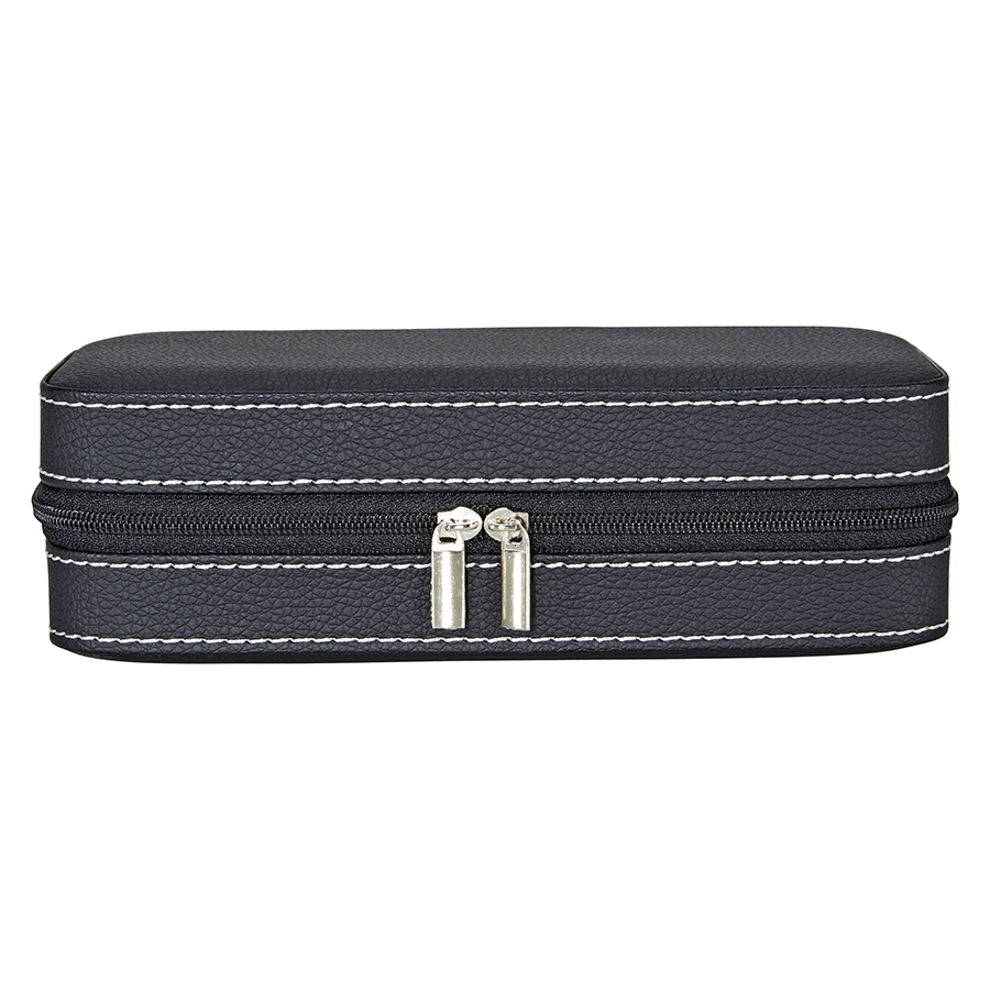 Double travel watch case in black PU leatherette with a zipper closure. The case interier is lined in velvet and will hold two watches with a case size up to a 55mm. Dimensions: 18 cm x 9 cm x 5.3 cm.