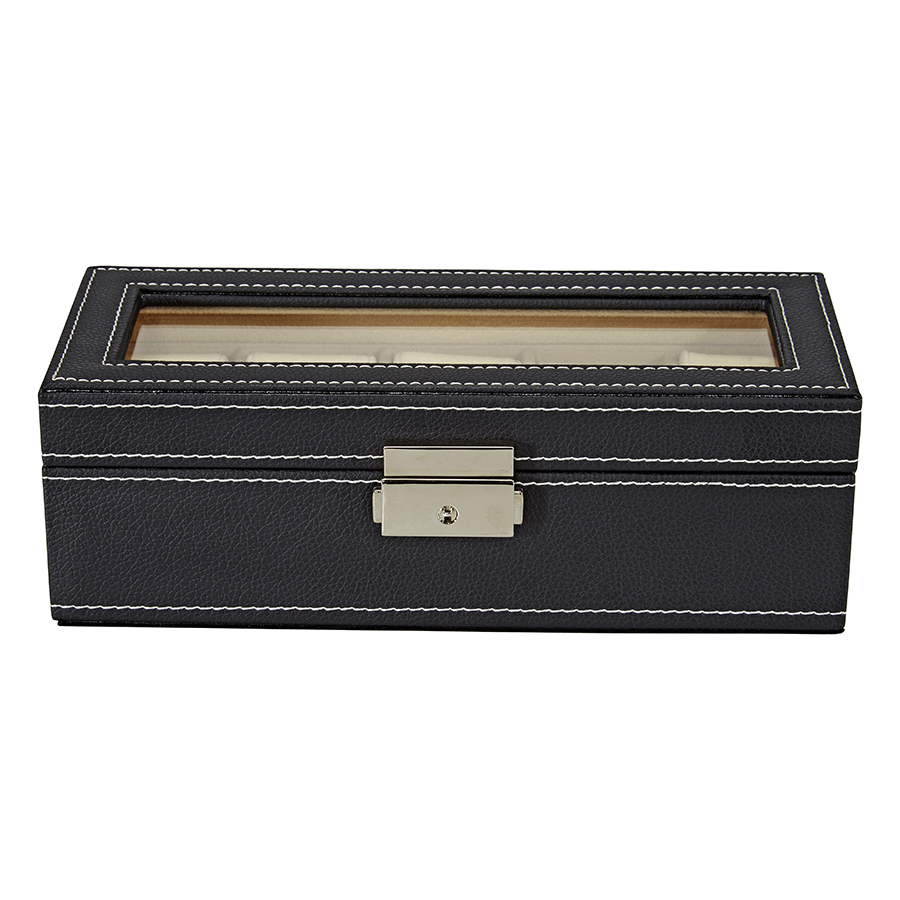 StarFive 5-piece lockable watch box in black PU leatherette with a velvet interior and a glass top. The box holds 5 watches with case sizes up to 55 mm. Dimensions: 23.3 cm x 10 cm x 7.3 cm.