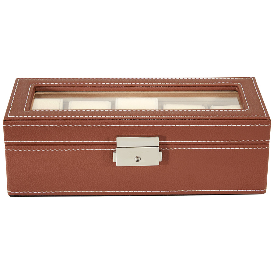 StarFive 5-piece lockable watch box in brown PU leatherette with a velvet interior and a glass top. The box holds 5 watches with case sizes up to 55 mm. Dimensions: 23.3 cm x 10 cm x 7.3 cm.