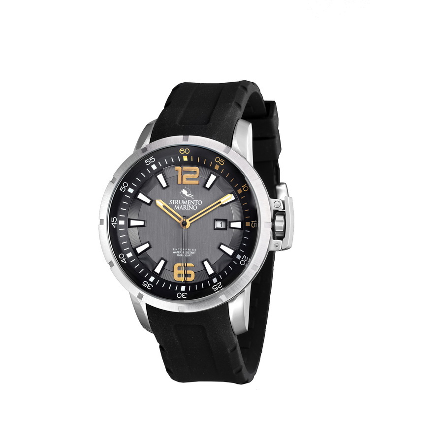 Silver-tone stainless steel case with a black silicone strap. Fixed silver-tone stainless steel bezel. Silver-tone dial with gold-tone hands and index hour markers. Minute markers around the outer rim. Dial Type: Analog. Luminescent hands and markers. Date display at the 3 o'clock position. Quartz movement. Scratch resistant mineral crystal. Solid case back. Round case shape, case size: 46 mm. Buckle clasp. Water resistant at 100 meters / 330 feet. Functions: date, hour, minute, second. Enterprise Series. Sport watch style. Strumento Marino Enterprise Quartz Silver Dial Mens Watch SM100S/SS/GR/NR.
