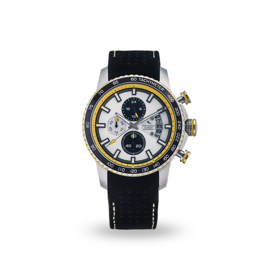 Silver-tone stainless steel case with a black leather strap. Fixed black stainless steel bezel. White dial with silver-tone hands and index hour markers. Tachymeter scale around the outer rim. Dial Type: Analog. Luminescent hands and markers. Date display at the 3 o'clock position. Chronograph - three sub-dials displaying: 60 second, 30 minute and 24 hour. Quartz movement. Scratch resistant mineral crystal. Solid case back. Round case shape, case size: 46 mm. Buckle clasp. Water resistant at 100 meters / 330 feet. Functions: chronograph, date, hour, minute, second, tachymeter scale. Freedom Leather Series. Sport watch style. Strumento Marino Freedom Leather Chronograph Quartz White Dial Mens Watch SM114L/SS/BN/GL/NR.