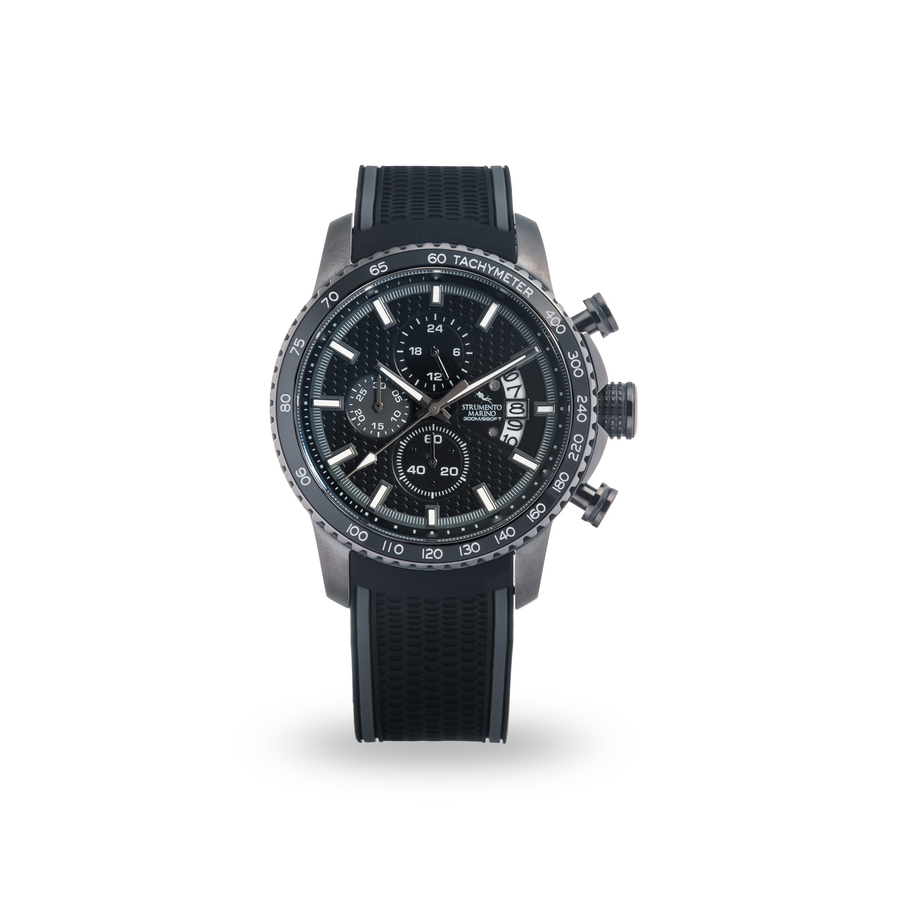 Black stainless steel case with a black silicone strap. Fixed black stainless steel bezel. Black dial with black hands and index hour markers. Tachymeter scale around the outer rim. Dial Type: Analog. Luminescent hands and markers. Date display at the 3 o'clock position. Chronograph - three sub-dials displaying: 60 second, 30 minute and 24 hour. Quartz movement. Scratch resistant mineral crystal. Solid case back. Round case shape, case size: 46 mm. Buckle clasp. Water resistant at 100 meters / 330 feet. Functions: chronograph, date, hour, minute, second, tachymeter scale. Freedom Silicon Series. Sport watch style. Strumento Marino Freedom Silicon Chronograph Quartz Black Dial Mens Watch SM114S/BK/NR/GR/NR.