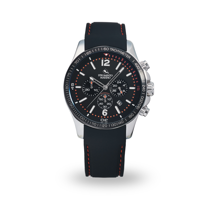 Silver-tone stainless steel case with a black silicone strap. Fixed black stainless steel bezel. Black dial with silver-tone hands and index hour markers. Tachymeter scale around the outer rim. Dial Type: Analog. Date display between 4 and 5 o'clock position. Chronograph - three sub-dials displaying: 60 second, 30 minute and 24 hour. Quartz movement. Scratch resistant mineral crystal. Solid case back. Round case shape, case size: 45 mm. Buckle clasp. Water resistant at 100 meters / 330 feet. Functions: chronograph, date, hour, minute, second, tachymeter scale. Lincoln Silicon Series. Sport watch style. Strumento Marino Lincoln Silicon Chronograph Quartz Black Dial Mens Watch SM115S/SS/NR/NR.