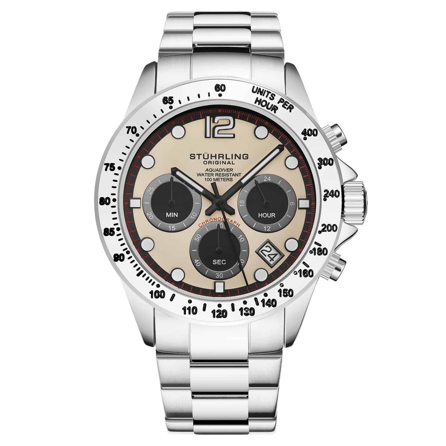 Men's Quartz Chronograph Beige Dial SS Bracelet Watch Silver-tone alloy case with a silver-tone stainless steel bracelet. Fixed silver-tone alloy bezel. Beige dial with black hands and index hour markers. Minute markers around the outer rim. Dial Type: Analog. Luminescent hands and markers. Date display between 4 and 5 o'clock position. Chronograph - three sub-dials displaying: 60 second, 30 minute and 24 hour. Quartz movement. Scratch resistant mineral crystal. Screw down crown. Solid case back. Round case shape, case size: 42 mm, case thickness: 12 mm. Fold over clasp with a safety release. Water resistant at 100 meters / 330 feet. Functions: chronograph, date, hour, minute, second. Aquadiver Series. Dive watch style. Stuhrling Original Aquadiver Beige Dial Mens Watch M15809.