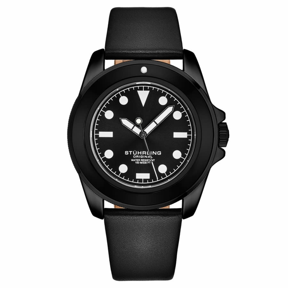Black alloy case with a black leather strap. Fixed black alloy bezel. Black dial with black hands and index hour markers. Minute markers around the outer rim. Dial Type: Analog. Luminescent hands and markers. Quartz movement. Scratch resistant mineral crystal. Solid case back. Round case shape, case size: 42 mm. Buckle clasp. Water resistant at 100 meters / 330 feet. Functions: hour, minute, second. Aquadiver Series. Dive watch style. Stuhrling Original Aquadiver Quartz Black Dial Mens Watch M17200.
