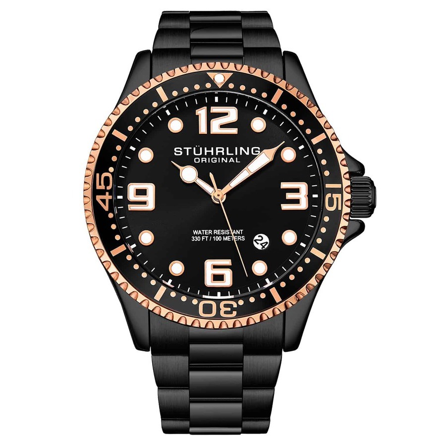 Men's Quartz Diver, Black Case, Rose/Gold Toned and Black Bezel, Black Dial, Luminous Rose/Gold Toned Hands and Markers, Black Link Bracelet Watch Black alloy case with a black stainless steel bracelet. Uni-directional rotating rose gold-tone alloy bezel. Black dial with rose gold-tone hands and Arabic numeral & index hour markers. Minute markers around the outer rim. Dial Type: Analog. Luminescent hands and markers. Date display between 4 and 5 o'clock position. Quartz movement. Scratch resistant mineral crystal. Screw down crown. Solid case back. Round case shape, case size: 44 mm, case thickness: 12 mm. Fold over clasp with a safety release. Water resistant at 100 meters / 330 feet. Functions: date, hour, minute, second. Aquadiver Series. Dive watch style. Stuhrling Original Aquadiver Black Dial Mens Watch M15944.