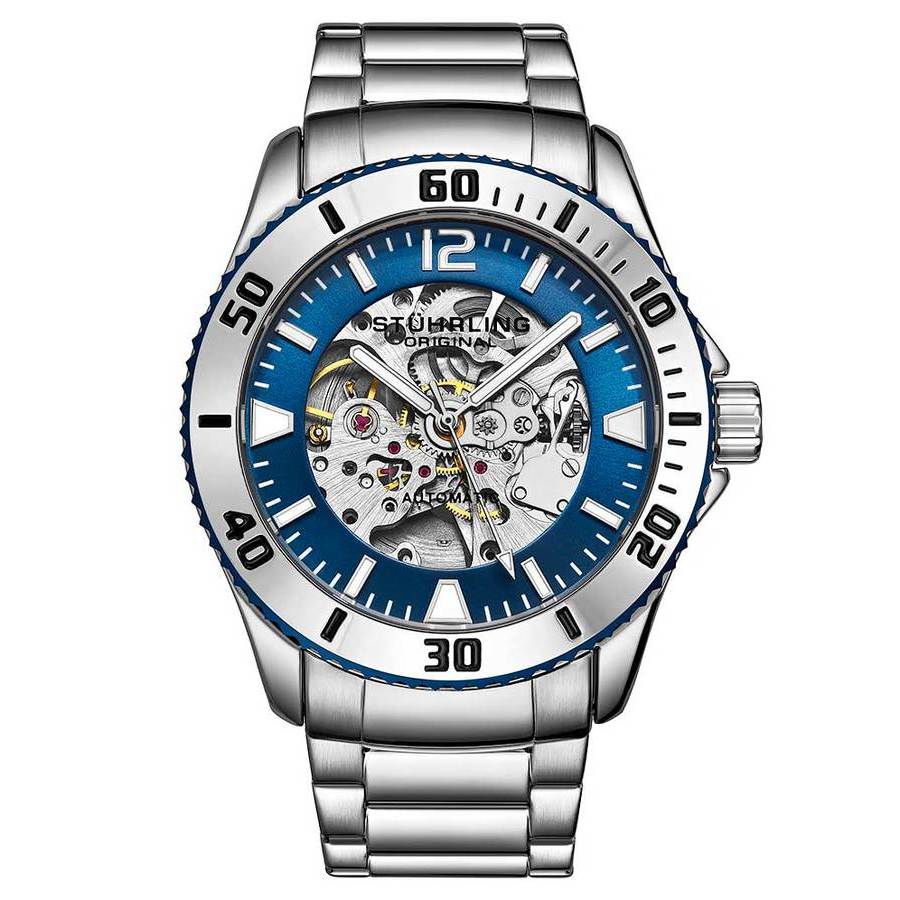 Men's Automatic Silver Case on Link Bracelet, Blue Skeletonized Dial, Blue Bezel, with Silver Tone and White Accents Silver-tone alloy case with a silver-tone stainless steel bracelet. Fixed blue stainless steel bezel. Blue dial with silver-tone hands and index hour markers. Minute markers around the outer rim. Dial Type: Analog. Luminescent hands and markers. Automatic movement. Scratch resistant mineral crystal. Screw down crown. Transparent case back. Round case shape, case size: 44 mm, case thickness: 15 mm. Fold over clasp with a safety release. Water resistant at 50 meters / 165 feet. Functions: hour, minute, second. Aquadiver Series. Dive watch style. Stuhrling Original Aquadiver Blue Dial Mens Watch M15819.