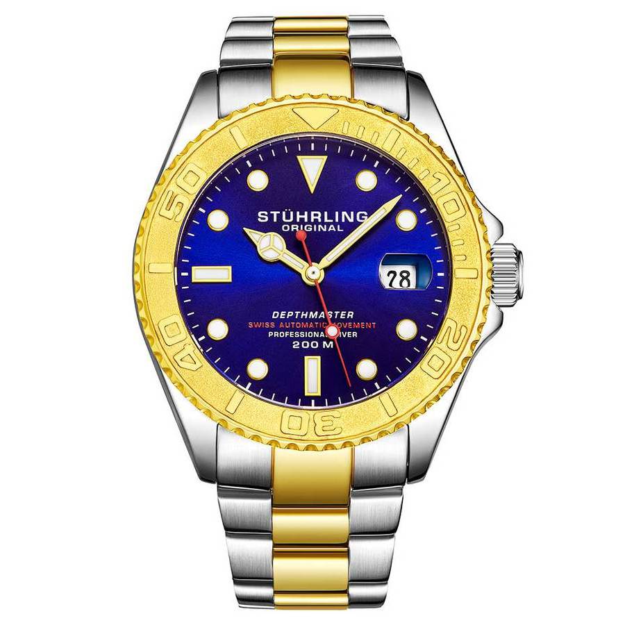 Silver-tone stainless steel case with a two-tone (silver-tone and yellow gold-tone) stainless steel bracelet. Uni-directional rotating yellow gold-tone stainless steel bezel. Purple dial with yellow gold-tone hands and Arabic numeral hour markers. Minute markers around the outer rim. Dial Type: Analog. Luminescent hands and markers. Date display at the 3 o'clock position. Automatic movement. Scratch resistant mineral crystal. Screw down crown. Transparent case back. Round case shape, case size: 42 mm, case thickness: 14 mm. Fold over clasp with a safety release. Water resistant at 200 meters / 660 feet. Functions: date, hour, minute, second. Aquadiver Series. Dive watch style. Stuhrling Original Aquadiver Purple Dial Mens Watch M15509.