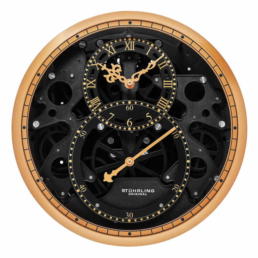 Brown alloy case. Fixed brown stainless steel bezel. Black dial with rose gold-tone hands and Roman numeral hour markers. Minute markers around the outer rim. Dial Type: Analog. Quartz movement. Scratch resistant mineral crystal. Round case shape, case size: 350 mm, case thickness: 95 mm. Functions: hour, minute, second. Aviator Series. Casual watch style. Stuhrling Original Aviator Quartz Black Dial Mens Watch M15464.