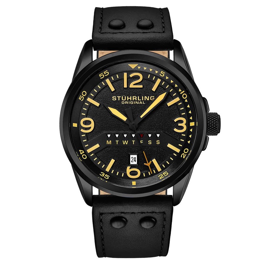 Black alloy case with a black leather strap. Fixed black alloy bezel. Black dial with black hands and Arabic numeral & index hour markers. Minute markers around the outer rim. Dial Type: Analog. Date display at the 6 o'clock position. Quartz movement. Scratch resistant mineral crystal. Pull / push crown. Solid case back. Round case shape, case size: 44 mm, case thickness: 8 mm. Buckle clasp. Water resistant at 50 meters / 165 feet. Functions: date, day, hour, minute, second. Aviator Series. Casual watch style. Stuhrling Original Aviator Black Dial Mens Watch M15276.