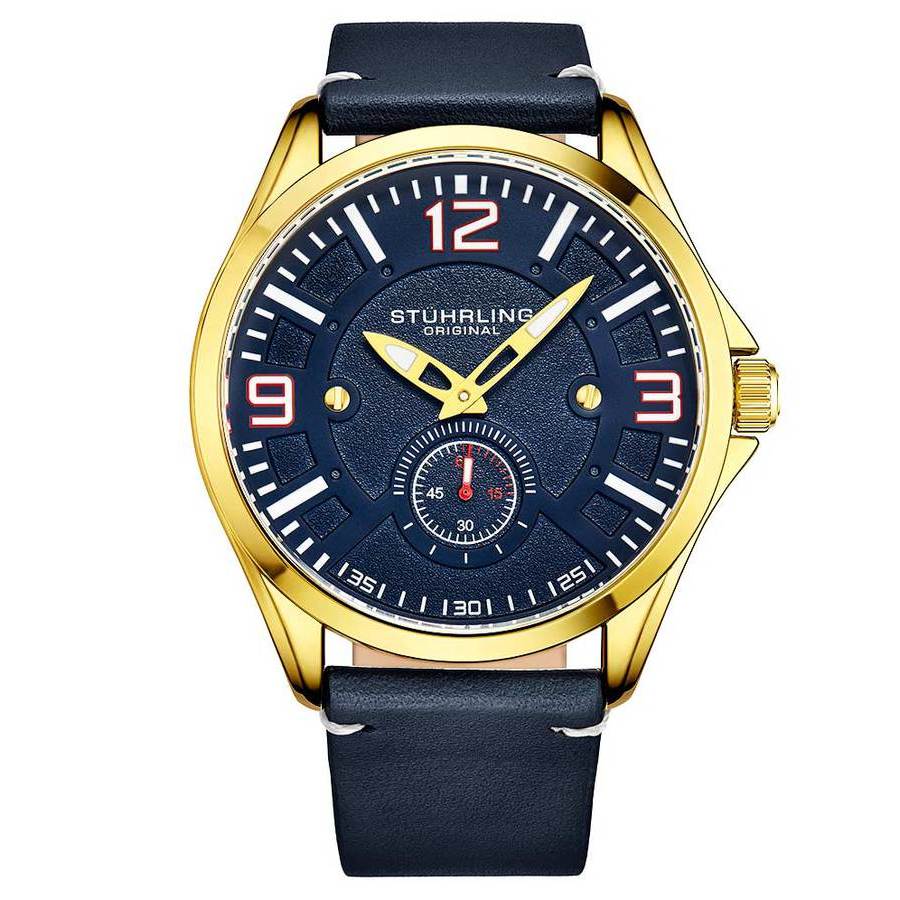 Earn your wings with the rugged, our top-class aviator watch that brings style and durability to your high-flying adventures. Yellow gold-tone alloy case with a blue leather strap. Fixed yellow gold-tone alloy bezel. Blue dial with yellow gold-tone hands and index hour markers. Minute markers around the outer rim. Dial Type: Analog. Luminescent hands and markers. Quartz movement. Scratch resistant mineral crystal. Screw down crown. Solid case back. Round case shape, case size: 43 mm, case thickness: 10 mm. Buckle clasp. Water resistant at 100 meters / 330 feet. Functions: hour, minute, second. Aviator Series. Casual watch style. Stuhrling Original Aviator Blue Dial Mens Watch M15685.