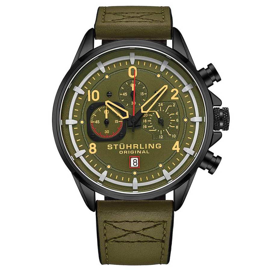 Men's Chrono Black Case, Green Dial with Red Accents, Tan Hands, Tan and Silver Markers, Green Leather Strap with Green Stitching Watch Black alloy case with a green leather strap. Fixed black alloy bezel. Green dial with black hands and Arabic numeral & index hour markers. Minute markers around the outer rim. Dial Type: Analog. Date display at the 6 o'clock position. Chronograph - three sub-dials displaying: 60 second, 60 minute and 24 hour. Quartz movement. Scratch resistant mineral crystal. Pull / push crown. Solid case back. Round case shape, case size: 45 mm, case thickness: 13 mm. Buckle clasp. Water resistant at 50 meters / 165 feet. Functions: chronograph, date, hour, minute, second. Aviator Series. Casual watch style. Stuhrling Original Aviator Green Dial Mens Watch M15555.