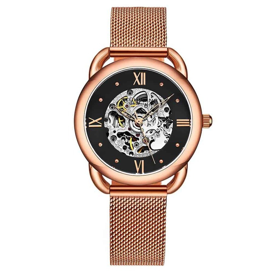 Ladies Automatic Rose/Gold Toned Case, Rose/Gold Toned Bezel, Black Dial, Rose/Gold Hands and Markers, Rose/Gold Toned Mesh Bracelet Watch Rose gold-tone alloy case with a rose gold-tone stainless steel bracelet. Fixed rose gold-tone alloy bezel. Black dial with rose gold-tone hands and Roman numeral hour markers. Dial Type: Analog. Automatic movement. Scratch resistant mineral crystal. Pull / push crown. Transparent case back. Round case shape, case size: 36 mm, case thickness: 13 mm. Fold over clasp. Water resistant at 50 meters / 165 feet. Functions: hour, minute, second. Legacy Series. Dress watch style. Stuhrling Original Legacy Black Dial Ladies Watch M15905.