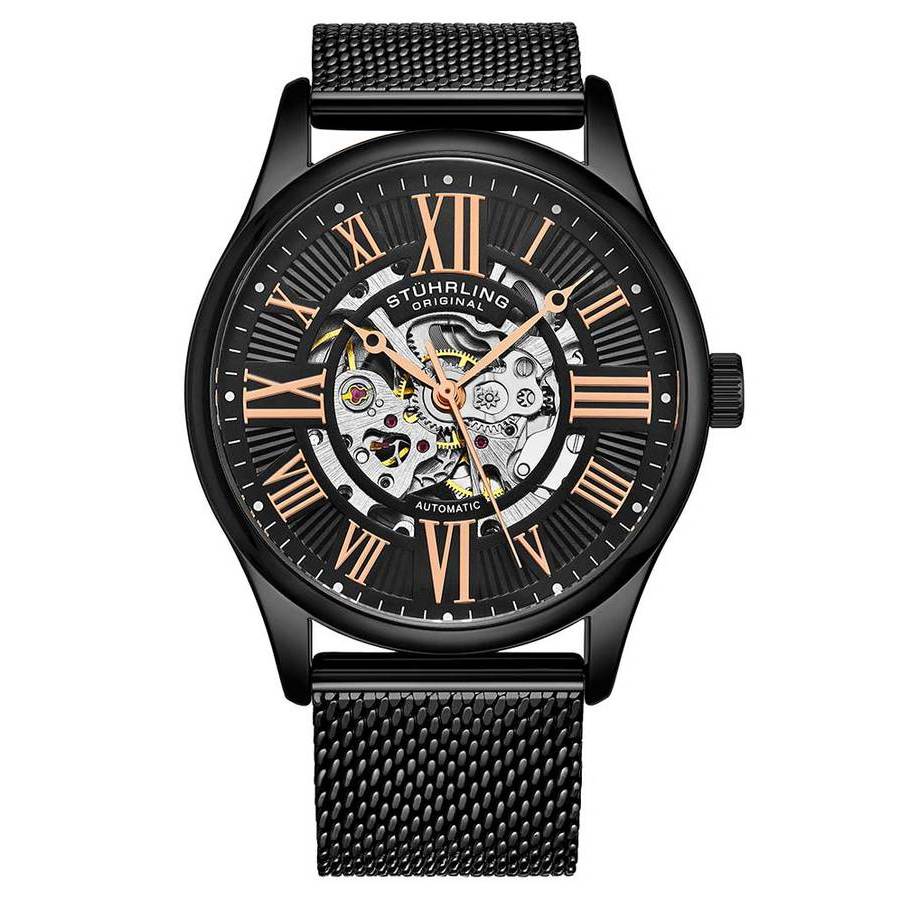 Men's Automatic Black Case, Black Polished Bezel, Black Skeletonized Dial With Gold Toned and Red Accents, Rose/Gold Toned Hands, Rose/Gold Markers, Black Mesh Bracelet Watch Black alloy case with a black stainless steel bracelet. Fixed black alloy bezel. Black dial with rose gold-tone hands and Roman numeral hour markers. Minute markers around the outer rim. Dial Type: Analog. Automatic movement. Scratch resistant mineral crystal. Pull / push crown. Transparent case back. Round case shape, case size: 42 mm, case thickness: 12 mm. Fold over clasp. Water resistant at 50 meters / 165 feet. Functions: hour, minute, second. Legacy Series. Dress watch style. Stuhrling Original Legacy Black Dial Mens Watch M15953.