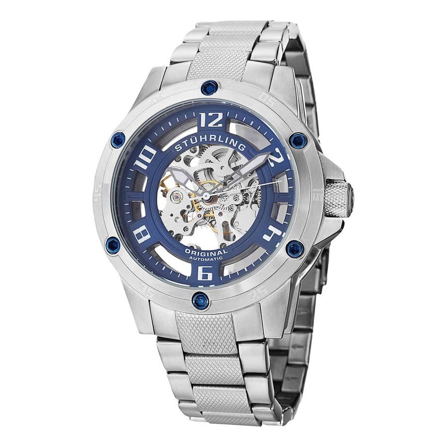 Silver-tone stainless steel case and bracelet. Fixed silver-tone stainless steel bezel. Blue dial with silver-tone hands and Arabic numeral & index hour markers. Minute markers around the outer rim. Dial Type: Analog. Luminescent hands and markers. Automatic movement. Scratch resistant mineral crystal. Pull / push crown. Transparent case back. Round case shape, case size: 50 mm, case thickness: 14 mm. Fold over clasp with a safety release. Water resistant at 50 meters / 165 feet. Functions: hour, minute, second. Legacy Series. Dress watch style. Stuhrling Original Legacy Blue Dial Mens Watch M15463.