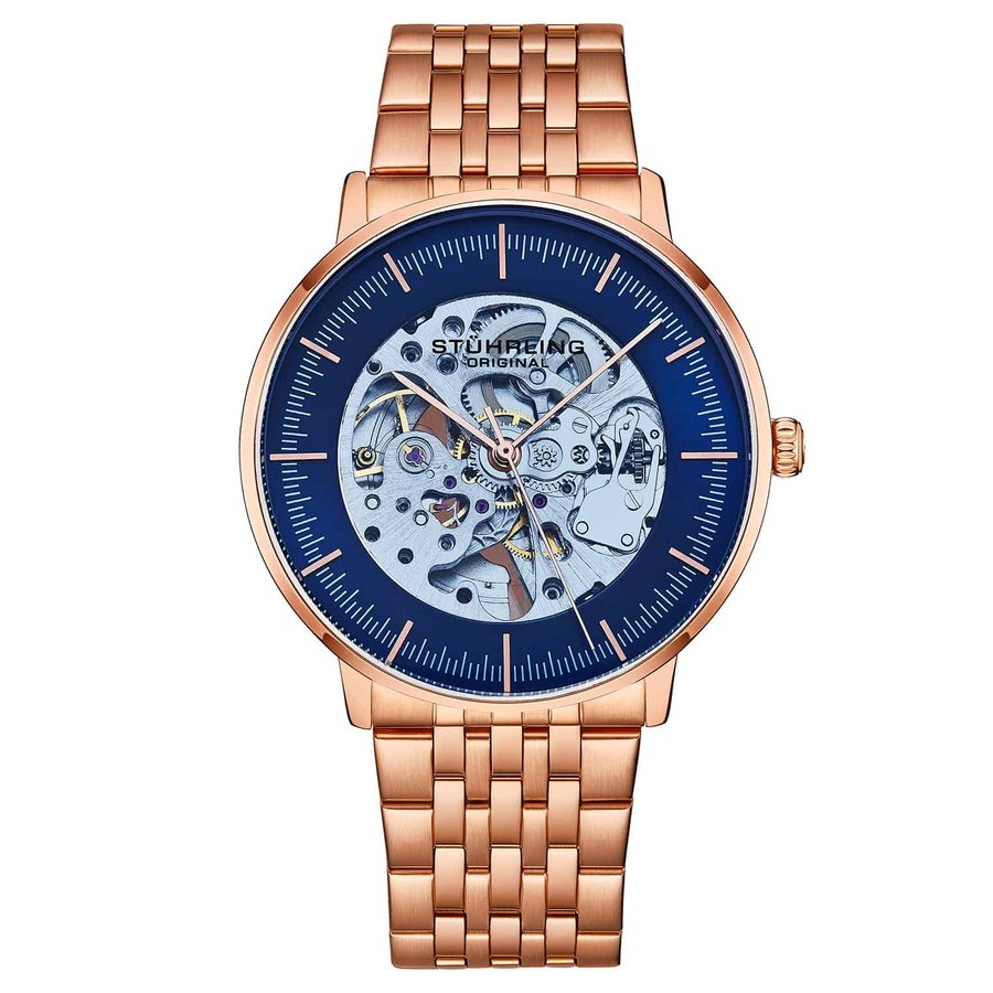 Men's Automatic Rose/Gold Toned Case, Rose/Gold Toned Bezel, Blue Tinted Glass, Blue Dial Ring with Silver Center With Gold Toned Colored Accent, Rose/Gold Toned Hands and Markers, Rose/Gold Toned Link Bracelet Watch Rose gold-tone alloy case with a rose gold-tone stainless steel bracelet. Fixed rose gold-tone alloy bezel. Blue dial with rose gold-tone hands and index hour markers. Minute markers around the outer rim. Dial Type: Analog. Automatic movement. Scratch resistant mineral crystal. Pull / push crown. Transparent case back. Round case shape, case size: 42 mm, case thickness: 12 mm. Deployment with push button release clasp. Water resistant at 30 meters / 100 feet. Functions: hour, minute, second. Legacy Series. Dress watch style. Stuhrling Original Legacy Blue Dial Mens Watch M15922.