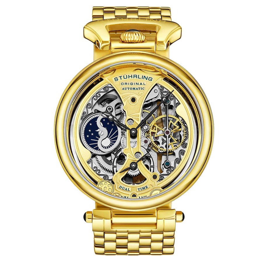 Yellow gold-tone alloy case with a yellow gold-tone stainless steel bracelet. Fixed yellow gold-tone alloy bezel. Gold (skeleton) dial with black hands. Dial Type: Analog. Two sub-dials displaying: 12 hour and day / night. Automatic movement. Scratch resistant mineral crystal. Pull / push crown. Transparent case back. Round case shape. Case size: 46 mm. Case thickness: 14 mm. Deployment clasp with a push button release. Water resistant at 50 meters / 165 feet. Functions: hour, minute, second. Legacy Series. Dress watch style. Stuhrling Original Legacy Gold Skeleton Dial Mens Watch M15935.