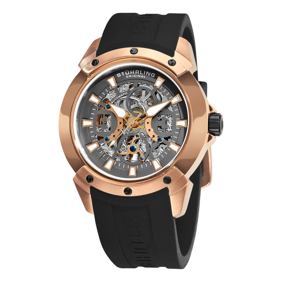 Rose gold-tone stainless steel case with a black silicone strap. Fixed rose gold-tone bezel. Grey dial with luminous rose gold-tone hands and index hour markers. Minute markers. Dial Type: Analog. Luminescent hands and markers. Automatic movement. Scratch resistant Krysterna crystal. Pull / push crown. Transparent case back. Round case shape. Case size: 46 mm. Case thickness: 13.45 mm. Band width: 24 mm, band length: 9 inches. Tang clasp. Water resistant at 50 meters / 165 feet. Functions: hour, minute, second. Legacy Series. Luxury watch style. Stuhrling Original Legacy Automatic Grey Dial Mens Watch M16234.