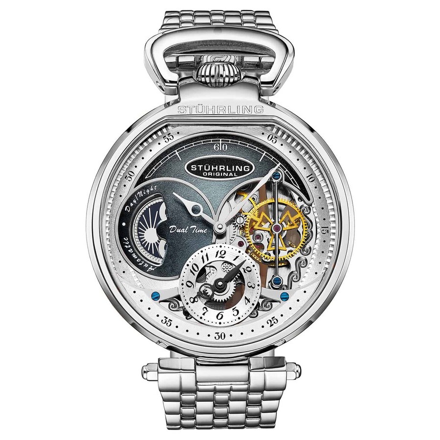 Introducing the new Modena Dual Time, Sun/Moon Phase Skeleton. Let this legacy automatic take over your wrist with a commanding 46mm case featuring an exhibition screw-down caseback. Silver-tone stainless steel case and bracelet. Fixed silver-tone stainless steel bezel. Silver-tone dial with silver-tone hands and Arabic numeral hour markers. Minute markers around the outer rim. Dial Type: Analog. Automatic movement. Scratch resistant mineral crystal. Pull / push crown. Transparent case back. Round case shape, case size: 46 mm, case thickness: 13 mm. Deployment with push button release clasp. Water resistant at 50 meters / 165 feet. Functions: hour, minute, second. Legacy Series. Dress watch style. Stuhrling Original Legacy Silver-tone Dial Mens Watch M15587.