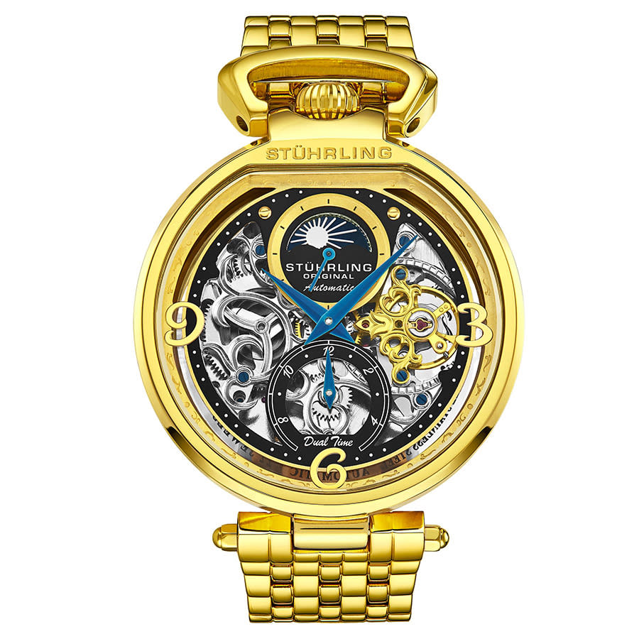 Gold-tone stainless steel case with a gold-tone stainless steel bracelet. Fixed gold-tone stainless steel bezel. Black dial with blue dauphine-style shape hands and Arabic numeral hour markers. Minute scale around the inner rim. Dial Type: Analog. Two - day/night indicator & dual time zone subdials. Automatic movement. Scratch resistant krysterna crystal. Pull / push crown. Transparent case back. Round case shape, case size: 46 mm, case thickness: 12.3 mm. Band length: 9.55 inches. Deployment with push button release clasp. Water resistant at 50 meters / 165 feet. Functions: hour, minute, second, day/night, dual time. Dress watch style. Stuhrling Original Legacy Automatic Black Dial Mens Watch Stuhrling Original Legacy Automatic Black Dial Mens Watch M13485
