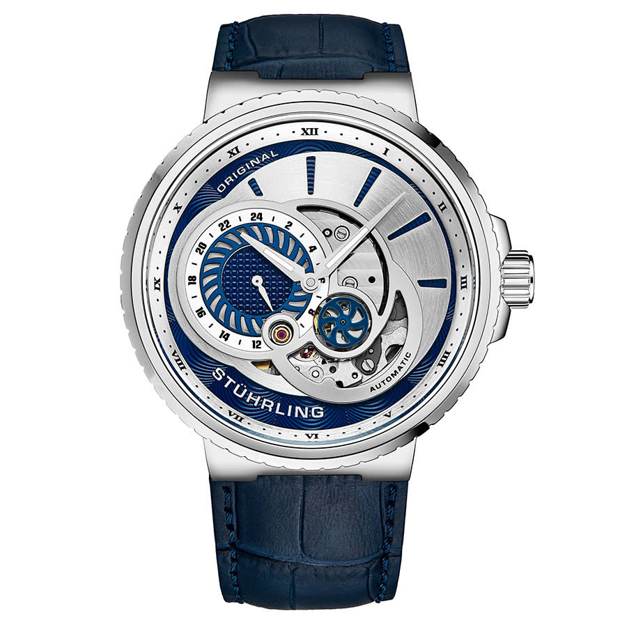 Silver-tone stainless steel case with a blue leather strap. Fixed silver-tone stainless steel bezel. Silver-tone dial with silver-tone hands and Roman numeral hour markers. Minute markers around the outer rim. Dial Type: Analog. Luminescent hands\. Automatic movement. Scratch resistant mineral crystal. Pull / push crown. Transparent case back. Round case shape, case size: 44.5 mm, case thickness: 13.25 mm. Band length: 9.25 inches. Buckle clasp. Water resistant at 50 meters / 165 feet. Functions: hour, minute. Dress watch style. Stuhrling Original Legacy Automatic Silver Dial Mens Watch Stuhrling Original Legacy Automatic Silver Dial Mens Watch M13504
