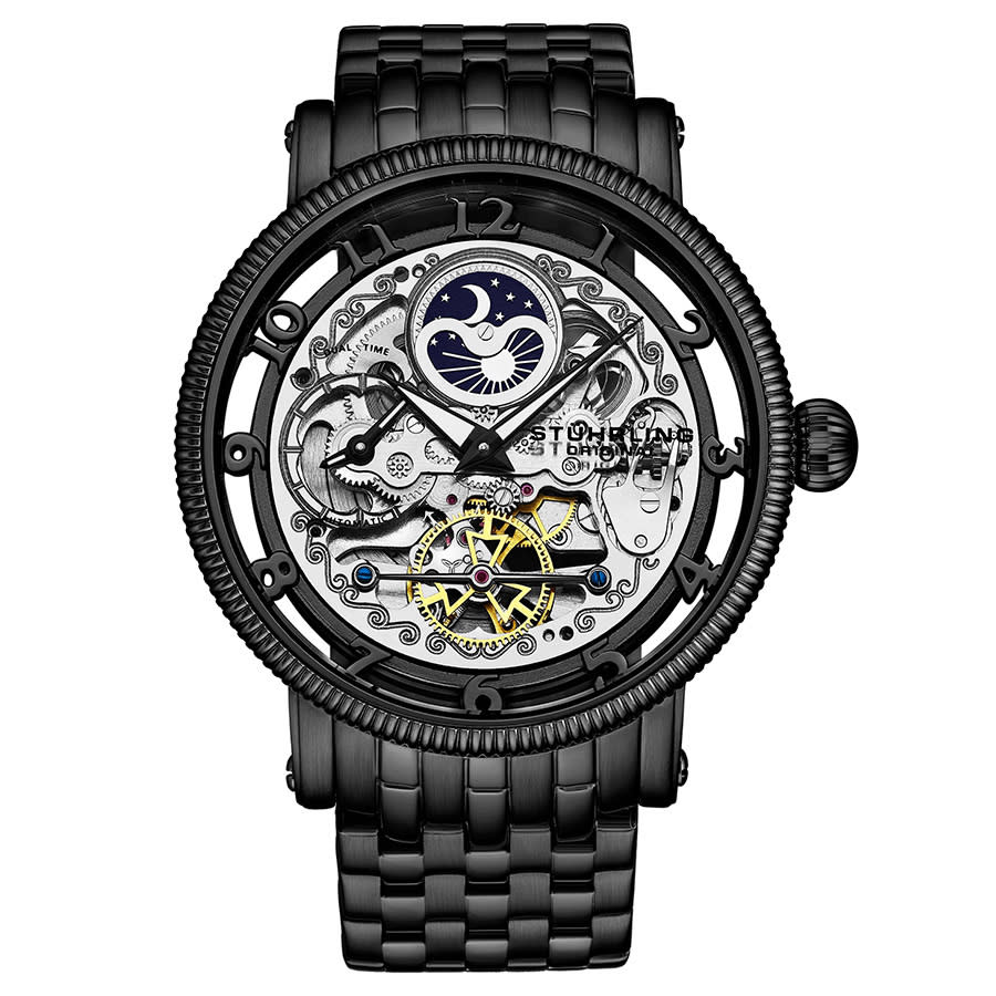 Black alloy case with a black stainless steel bracelet. Fixed black alloy bezel. Black dial with black dauphine-style shape hands and Arabic numeral hour markers. Dial Type: Analog. Luminescent hands. Two - am/pm indicator, dual time subdials. Automatic movement. Scratch resistant mineral crystal. Pull / push crown. Transparent case back. Round case shape, case size: 48.2 mm, case thickness: 12.75 mm. Band length: 8.25 inches. Deployment with push button release clasp. Water resistant at 50 meters / 165 feet. Functions: hour, minute, am/pm indicator, dual time. Dress watch style. Stuhrling Original Legacy Automatic Black Dial Mens Watch M13559.