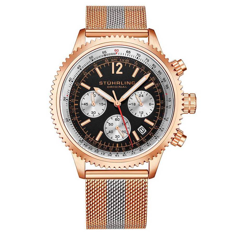 Rose gold-tone stainless steel case and bracelet. Fixed rose gold-tone alloy bezel. Black dial with rose gold-tone hands and index hour markers. Minute markers around the outer rim. Dial Type: Analog. Luminescent hands. Date display between 4 and 5 o'clock position. Chronograph - three sub-dials displaying: 60 second, 60 minute and 24 hour. Quartz movement. Scratch resistant mineral crystal. Screw down crown. Solid case back. Round case shape, case size: 42 mm, case thickness: 12 mm. Buckle clasp. Water resistant at 50 meters / 165 feet. Functions: chronograph, date, hour, minute, second. Monaco Series. Sport watch style. Stuhrling Original Monaco Black Dial Mens Watch M15383.