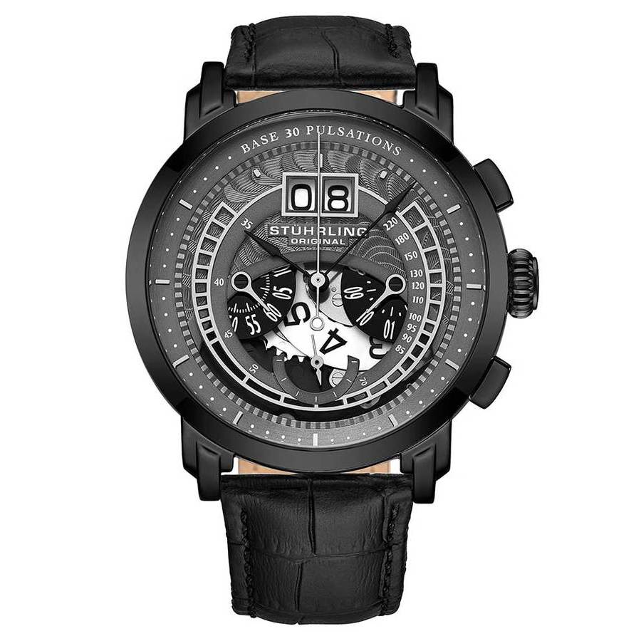 Black Case, Black Face, Day of Month, Pulsometer, Chronograph, Moving One Tenth Second Sub-dial at 3oclock, Leather Strap Black stainless steel case with a black leather strap. Fixed black stainless steel bezel. Black dial with black hands and index hour markers. Minute markers around the outer rim. Dial Type: Analog. Date display at the 12 o'clock position. Quartz movement. Scratch resistant mineral crystal. Pull / push crown. Solid case back. Round case shape, case size: 44 mm, case thickness: 15 mm. Buckle clasp. Water resistant at 50 meters / 165 feet. Functions: date, hour, minute, second. Monaco Series. Sport watch style. Stuhrling Original Monaco Black Dial Mens Watch M15551.