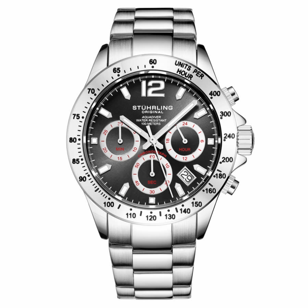 Men's Chrono, Silver Case, Silver Bezel, Black Dial With Silver Subdials And Red Accents, Luminous Silver Hands And Markers, Silver Bracelet Watch Silver-tone alloy case with a silver-tone stainless steel bracelet. Fixed silver-tone alloy bezel. Black dial with silver-tone hands and index hour markers. Minute markers around the outer rim. Dial Type: Analog. Luminescent hands and markers. Date display at the o'clock position. Chronograph - three sub-dials displaying: 60 second, 30 minute and 24 hour. Quartz movement. Scratch resistant mineral crystal. Screw down crown. Round case shape, case size: 42 mm, case thickness: 12 mm. Fold over clasp with a safety release. Water resistant at 100 meters / 330 feet. Functions: chronograph, date, hour, minute, second. Monaco Series. Sport watch style. Stuhrling Original Monaco Black Dial Mens Watch M15813.