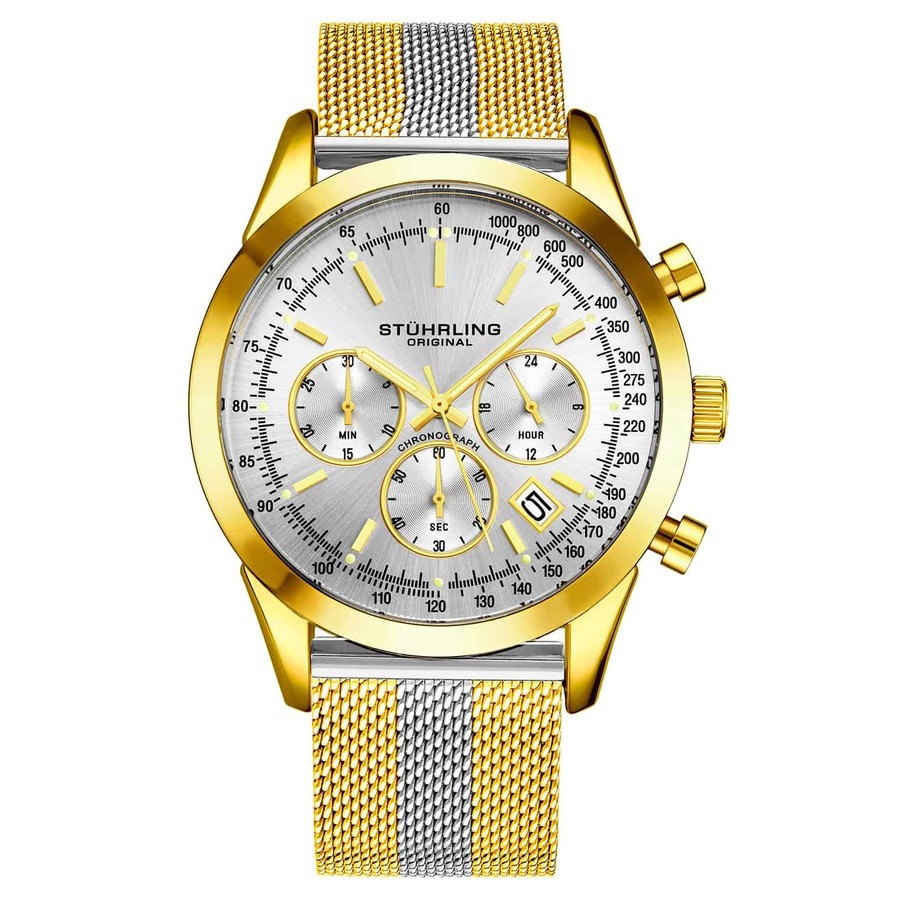 Men's Quartz Chronograph Date Watch, Gold Tone Alloy Case, Silver Dial, Gold and Silver Tone Stainless Steel Mesh Bracelet Yellow gold-tone alloy case with a two-tone (silver-tone and yellow gold-tone) alloy bracelet. Fixed yellow gold-tone alloy bezel. Silver-tone dial with yellow gold-tone hands and index hour markers. Minute markers around the outer rim. Dial Type: Analog. Date display between 4 and 5 o'clock position. Chronograph - three sub-dials displaying: 60 second, 30 minute and 24 hour. Quartz movement. Scratch resistant mineral crystal. Pull / push crown. Solid case back. Round case shape, case size: 44 mm, case thickness: 10 mm. Fold over clasp. Water resistant at 100 meters / 330 feet. Functions: chronograph, date, hour, minute, second. Monaco Series. Sport watch style. Stuhrling Original Monaco Silver-tone Dial Mens Watch M15858.