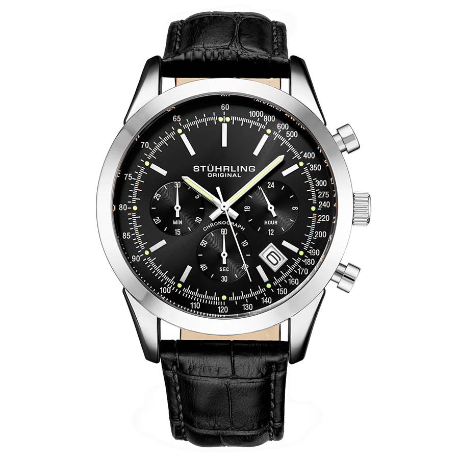 Silver-tone alloy case with a black leather strap. Fixed silver-tone alloy bezel. Black dial with luminous silver-tone stick-shaped hands and index hour markers. Minute markers. Tachymeter markers around the outer rim. Dial Type: Analog. Luminescent hands and markers. Date display between the 4 and 5 o'clock positions. Chronograph - three sub-dials displaying: 60 second, 30 minute and 24 hour. Quartz movement. Scratch resistant mineral crystal. Pull / push crown. Solid case back. Round case shape. Case size: 44 mm. Case thickness: 10.5 mm. Band width: 20 mm. Cand length: 8.5 inches. Tang clasp. Water resistant at 100 meters / 330 feet. Functions: date, hour, minute, second, 24 hour, tachymeter. Monaco Series. Sport watch style. Stuhrling Original Monaco Quartz Black Dial Mens Watch M13659.