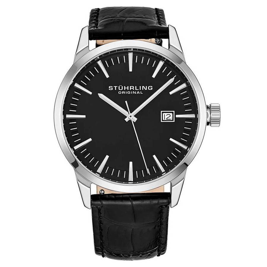 Silver-tone stainless steel case with a black leather strap. Fixed silver-tone stainless steel bezel. Black dial with silver-tone hands and index hour markers. Minute markers around the outer rim. Dial Type: Analog. Date display at the 3 o'clock position. Quartz movement. Scratch resistant mineral crystal. Pull / push crown. Solid case back. Round case shape, case size: 42 mm, case thickness: 10 mm. Buckle clasp. Water resistant at 50 meters / 165 feet. Functions: date, hour, minute, second. Symphony Series. Dress watch style. Stuhrling Original Symphony Black Dial Mens Watch M15294.