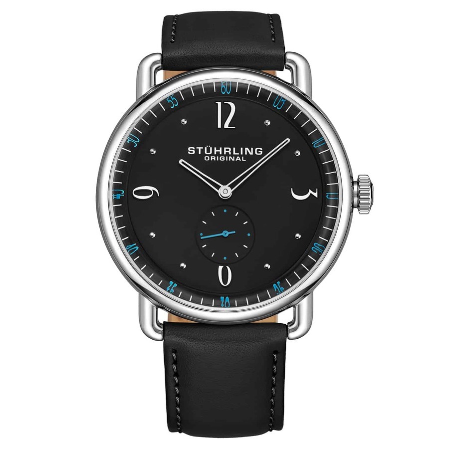 Silver-tone stainless steel case with a black leather strap. Fixed silver-tone stainless steel bezel. Black dial with silver-tone hands and Arabic numeral hour markers. Minute markers around the outer rim. Dial Type: Analog. Quartz movement. Scratch resistant mineral crystal. Pull / push crown. Solid case back. Round case shape, case size: 42 mm, case thickness: 10 mm. Buckle clasp. Water resistant at 50 meters / 165 feet. Functions: hour, minute, second. Symphony Series. Dress watch style. Stuhrling Original Symphony Black Dial Mens Watch M15481.