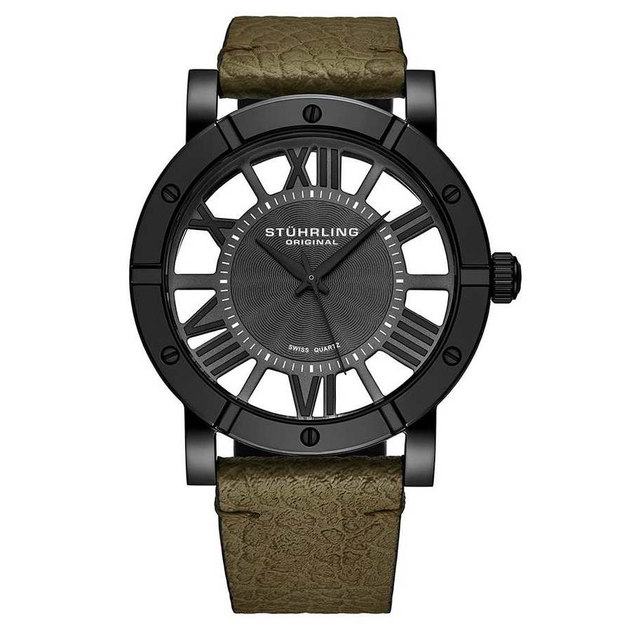 Black stainless steel case with a green leather strap. Fixed black stainless steel bezel. Black dial with black hands and Roman numeral hour markers. Minute scale around the inner rim. Dial Type: Analog. Quartz movement. Scratch resistant mineral crystal. Pull / push crown. Transparent case back. Round case shape, case size: 42 mm, case thickness: 8 mm. Buckle clasp. Water resistant at 50 meters / 165 feet. Functions: hour, minute, second. Symphony Series. Dress watch style. Stuhrling Original Symphony Black Dial Mens Watch M15501.