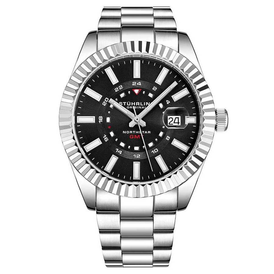 Stainless steel case with a stainless steel bracelet. Fixed stainless steel bezel. Black dial with luminous silver-tone hands and index hour markers. 24 hour markers. Minute markers around the outer rim. Dial Type: Analog. Luminescent hands and markers. Date display at the 3 o'clock position. Quartz movement. Scratch resistant mineral crystal. Pull / push crown. Solid case back. Round case shape. Case size: 42 mm. Case thickness: 10 mm. Band width: 20 mm. Fold over clasp with a safety release. Water resistant at 50 meters / 165 feet. Functions: date, hour, minute, second. Symphony Series. Dress watch style. Stuhrling Original Symphony Black Dial Mens Watch M15507.
