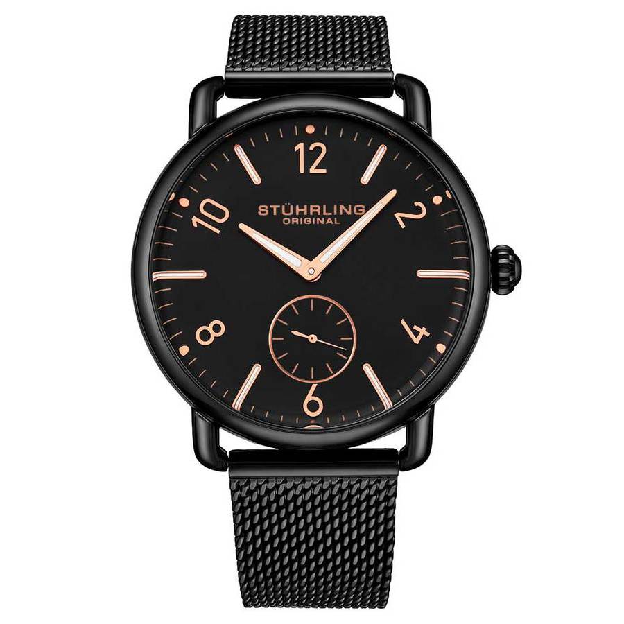 Give your wrist a shot of style with the retro design and unparalleled comfort of the Jenson. Black alloy case with a black stainless steel bracelet. Fixed black alloy bezel. Black dial with rose gold-tone hands and index hour markers. Minute markers around the outer rim. Dial Type: Analog. Quartz movement. Scratch resistant mineral crystal. Pull / push crown. Solid case back. Round case shape, case size: 42 mm, case thickness: 8 mm. Deployment with push button release clasp. Water resistant at 50 meters / 165 feet. Functions: hour, minute, second. Symphony Series. Dress watch style. Stuhrling Original Symphony Black Dial Mens Watch M15714.