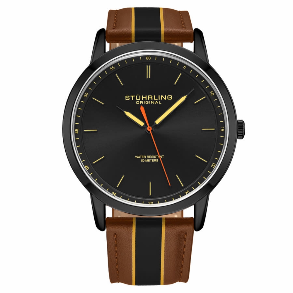 An instant classic; the Stuhrling Quartz Classic features syringe hands paired within a thin 7.5mm case for that timeless look with a modern twist. Choose your look with five different leather strap designs. Black alloy case with a brown leather strap. Fixed black alloy bezel. Black dial with black hands and index hour markers. Minute markers around the outer rim. Dial Type: Analog. Luminescent hands and markers. Quartz movement. Scratch resistant mineral crystal. Pull / push crown. Solid case back. Round case shape, case size: 44 mm, case thickness: 7 mm. Band width: 22 mm, band length: 8.5 inches. Buckle clasp. Water resistant at 50 meters / 165 feet. Functions: hour, minute, second. Symphony Series. Dress watch style. Stuhrling Original Symphony Quartz Black Dial Mens Watch M17067.