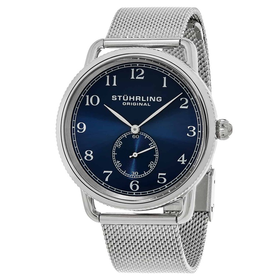 Stainless steel case with a stainless steel mesh bracelet. Fixed stainless steel bezel. Blue dial with silver-tone hands and Arabic numeral hour markers. Minute markers around the outer rim. Dial Type: Analog. Small seconds subdials. Quartz movement. Scratch resistant mineral crystal. Screw down crown. Solid case back. Round case shape. Case size: 40 mm. Case thickness: 10 mm. Band width: 20 mm. Fold over slip through clasp. Water resistant at 50 meters / 165 feet. Functions: hour, minute, second. Symphony Series. Dress watch style. Watch label: Made in Germany. Stuhrling Original Symphony Blue Dial Mens Watch M15249.