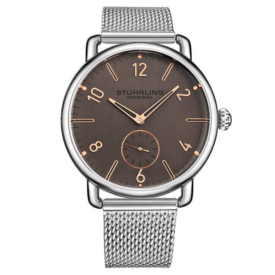 Give your wrist a shot of style with the retro design and unparalleled comfort of the Jenson. Silver-tone alloy case with a silver-tone stainless steel bracelet. Fixed silver-tone alloy bezel. Brown dial with rose gold-tone hands and index hour markers. Minute markers around the outer rim. Dial Type: Analog. Quartz movement. Scratch resistant mineral crystal. Pull / push crown. Solid case back. Round case shape, case size: 42 mm, case thickness: 8 mm. Deployment with push button release clasp. Water resistant at 50 meters / 165 feet. Functions: hour, minute, second. Symphony Series. Dress watch style. Stuhrling Original Symphony Brown Dial Mens Watch M15712.